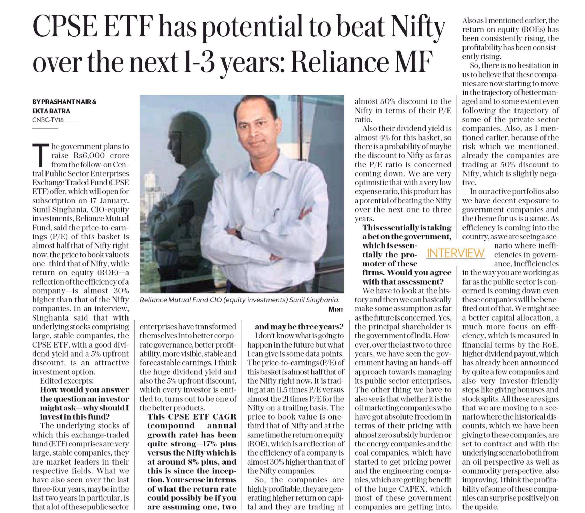 Reliance MF : ” CPSE ETF has the potential to beat NIFTY in next 1-3 years. Click Here